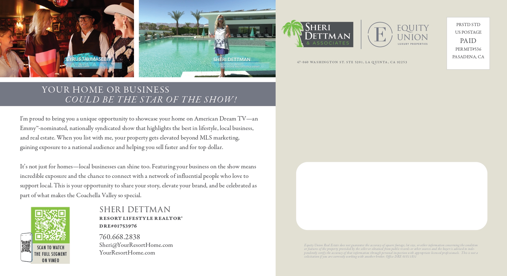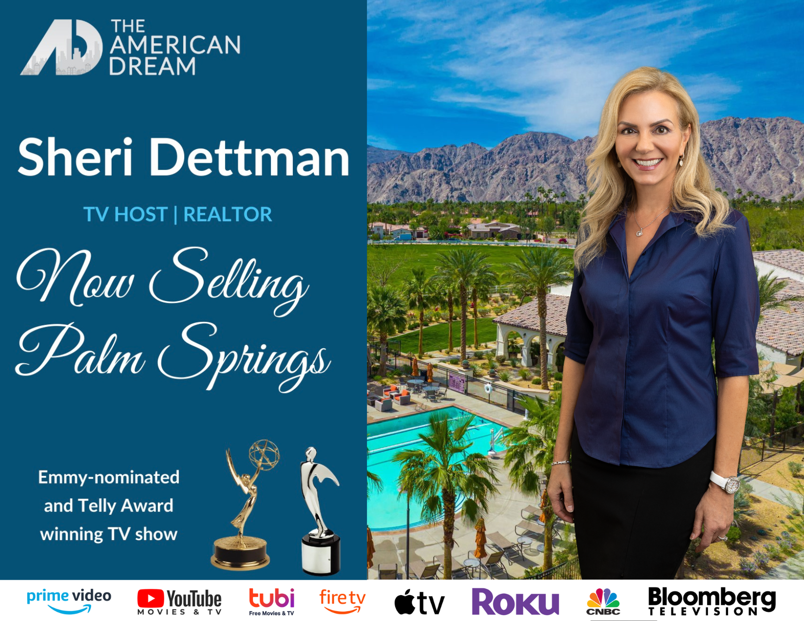 “We are delighted to have Sheri Dettman on board as our new Lifestyle and Real Estate Host for the Palm Springs area region,” said Executive show producer, Craig Sewing, Inman News Nominee for “Most Influential in Real Estate. “We hand-pick the best of each market to be positioned as host, and with Sheri’s addition to the team, The American Dream will be able to deliver even more exceptional content to its viewers.”